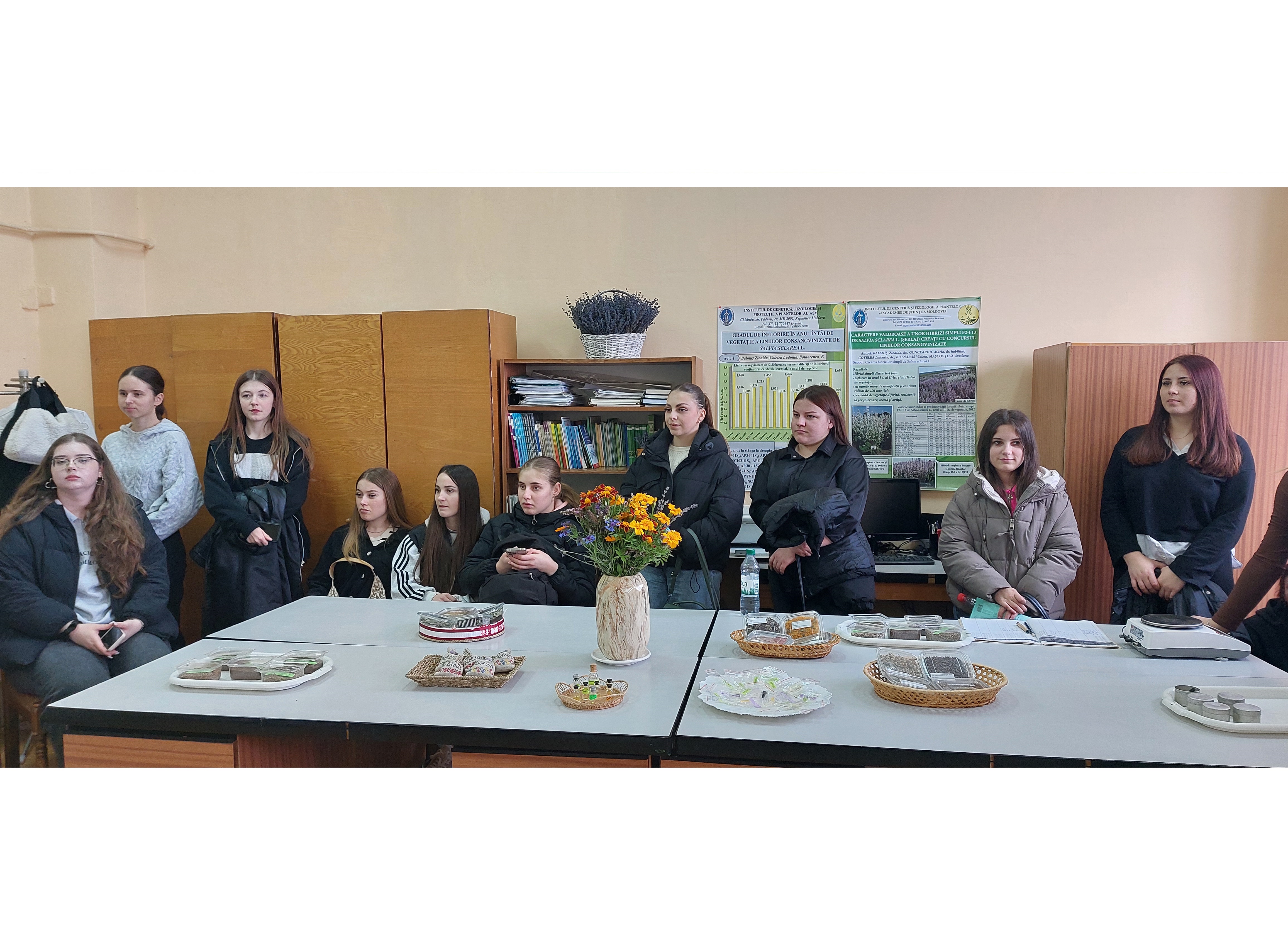 Vizita a început în cadrul Laboratorului Plante Aromatice și Medicinale, condus de dr. Zinaida BALMUȘ, conferențiar cercetător, care a demonstrat infrastructura de cercetare disponibilă, privind tehnicile de separare a uleiului esențial și colecția de germoplasmă de plante aromatice și medicinale. Șefa laboratorului a expus importanța plantelor aromatice, medicinale și condimentare, menționând că utilizarea acestora în scopuri terapeutice se bazează pe principiile active, compușii care îi sintetizează şi acumulează. Elevii au fost familiarizați cu rezultatele cercetărilor efectuate în cadrul Laboratorului Plante Aromatice și Medicinale la speciile: Lavandula angustifolia Mill. (levănțică) și Salvia sclarea L. (șerlai).
