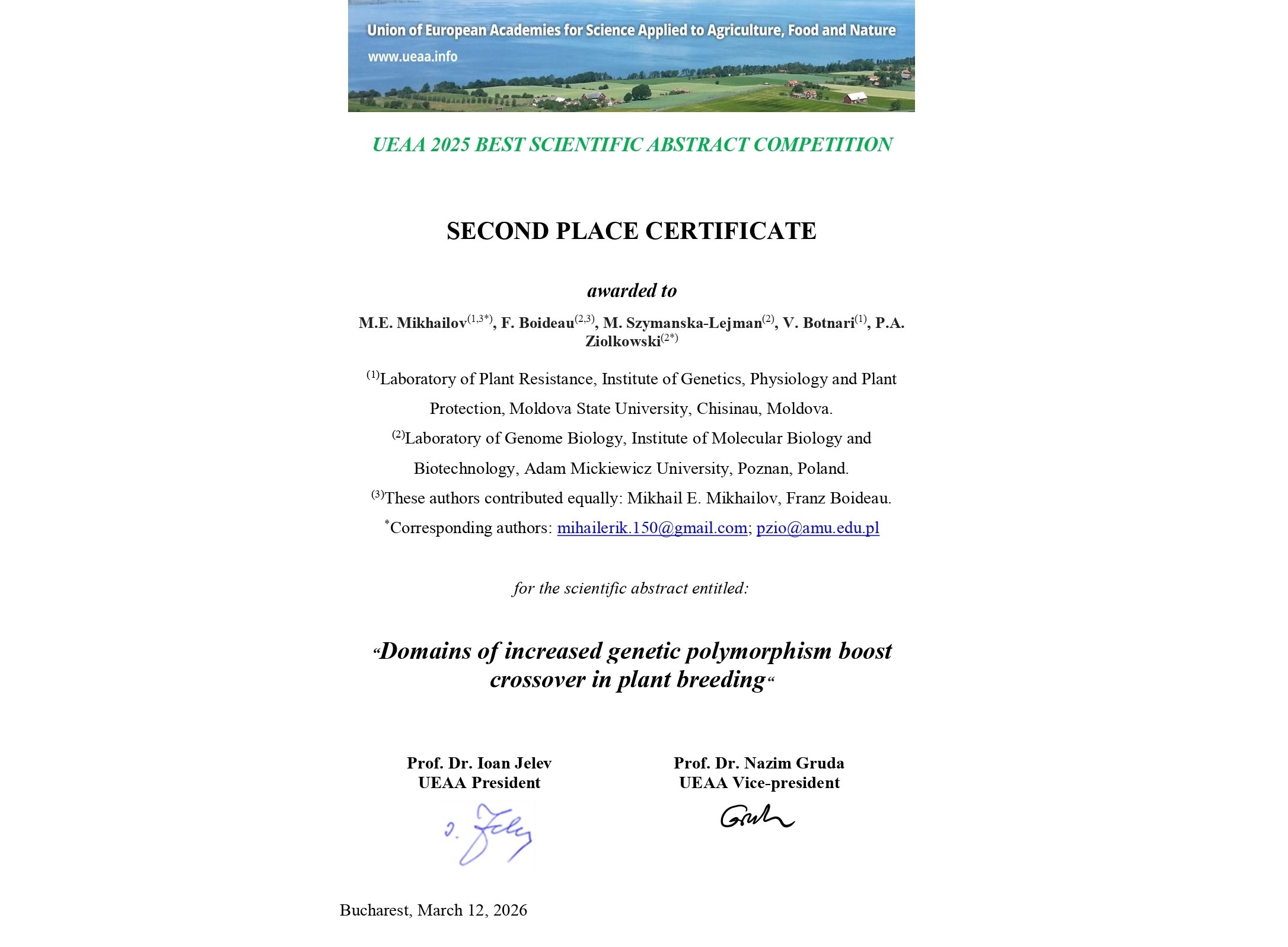 Realizările științifice valoroase obținute în multitudinea de instituții și centre de cercetare relevante din cadrul universităților și academiilor agricole din țările europene, inclusiv Republica, au fost evaluate de o comisie formată din personalități științifice de renume, recunoscute la nivel mondial. Astfel, rezumatul echipei de cercetare a laboratorului Genetica Rezistenței Plantelor al IGFPP în colaborare cu cercetătorii Laboratorului Biologie Genomică al Institutului de Biologie Moleculară și Biotehnologie (Universitatea Adam Mickiewicz, Poznan, Polonia), cu referire la elaborarea și utilizarea biotehnologiilor avansate în ameliorarea plantelor „Domains of increased genetic polymorphism boost crossover in plant breeding”, autori: M.E. Mikhailov, F. Boideau, M. Szymanska-Lejman, V. Botnari, P.A. Ziolkowski, a fost apreciată înalt și s-a clasat pe locul doi.