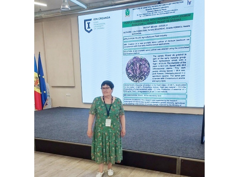 - Purple common basil with cinnamon flavor (Ocimum basilicum L.) variety Picant de grădină. MD 459 / 2025.03.31; Authors: Lilia CHISNICEAN, Tamara JELEZNEAC, Zinaida VORNICU, Natalia BARANOVA - (Medalie de Aur)
